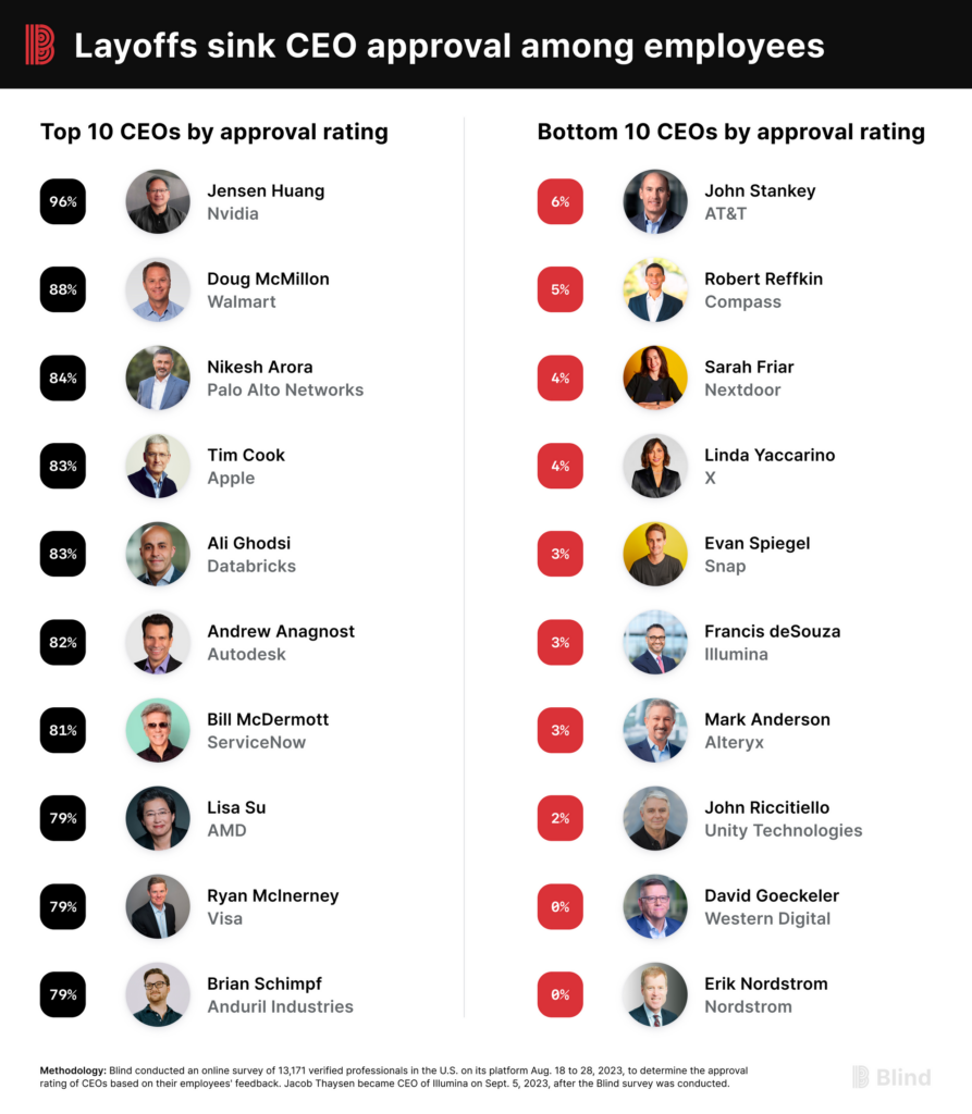 He received the highest percentage of approval for the way he runs the company, at 96 percent. One of the comments that best describes Huang, written by an Nvidia employee on Blind, is: He predicted AI mania more than a decade ago. I trust him completely. Also, when layoffs were pouring in at numerous tech companies last year, and Nvidia was not performing as expected, Huang told employees that not only would there be no layoffs, but some would also get raises.